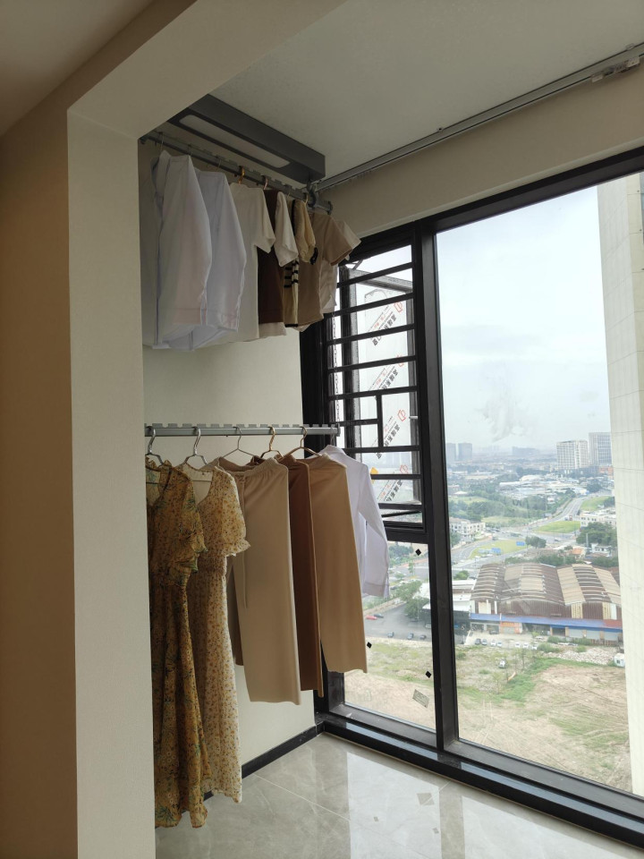 在侧边装上晾衣架,衣物在侧边晾晒,不要横在中间挡住阳光。