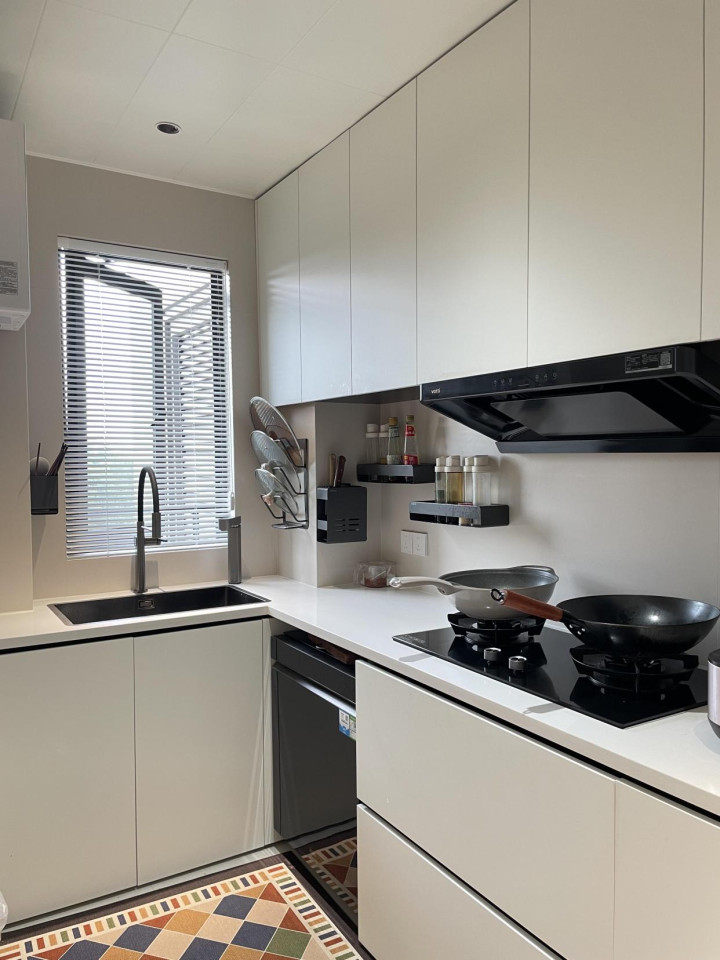 收纳上,能塞进柜子的东西绝不放台面,多做抽屉,抽屉里面还可以做好分隔,把调料、餐具、厨具都归置妥当。